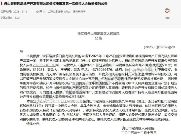 • 舟山碧桂园房地产开发有限公司:浙江省舟山市定海区人民法院已于2025年11月25日正式裁定受理该公司的破产清算申请,并指定了破产管理人 。债权人需在2026年2月10日前向管理人申报债权,第一次债权人会议定于2026年3月11日召开 。该公司的破产申请由供应商“宁波祥瑞建筑门窗有限公司”提出 。值得注意的是,该公司在进入破产程序前已涉及多起司法案件,包括建设工程施工合同纠纷、房屋买卖合同纠纷等,并被列入被执行人,这反映了其长期面临的经营压力 。