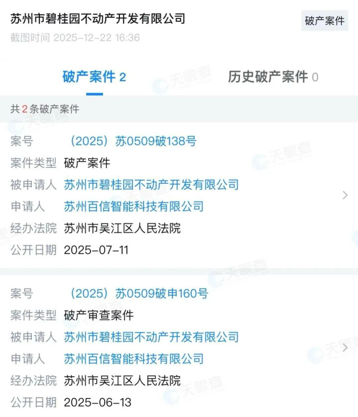 • 苏州市碧桂园不动产开发有限公司:江苏省苏州市吴江区人民法院已于2025年6月12日立案审查对该公司的破产清算申请,申请方为“苏州百信智能科技有限公司” 。根据后续公告,管理人对职工债权的调查显示,该公司无结欠职工工资和社保费用的情况 。此外,在苏州地区,碧桂园旗下其他项目公司如常熟市金碧房地产开发有限公司(开发“鲲湖天境”项目)也已被申请破产 ,表明碧桂园在苏州区域的整体项目运营面临挑战。